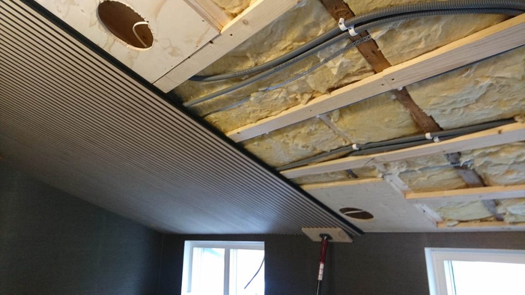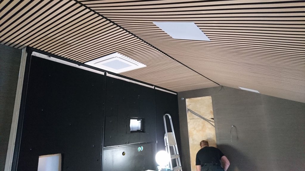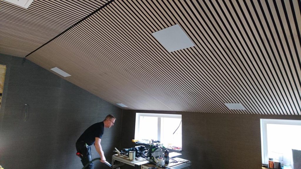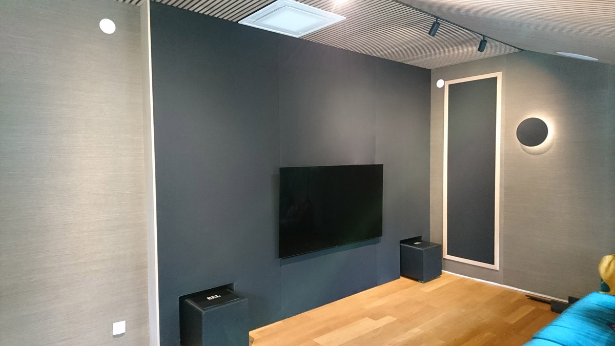 Vardagsrum med dolda högtalare Akustikbehandlat vardagsrum med högtalarna dolda bakom transparent tyg i frontväggen, samt högtalare i taket för Atmos-effekter. Inläggsdatum 11 juni 2023