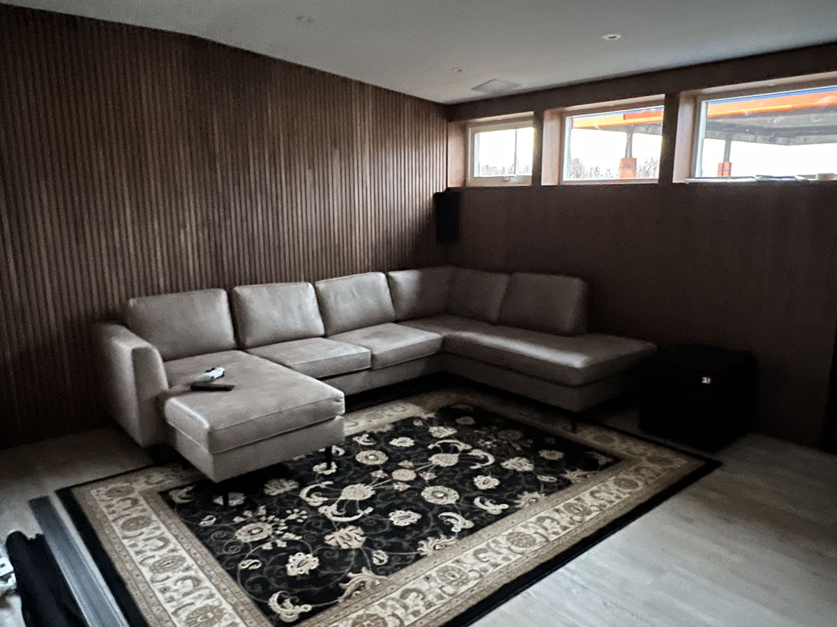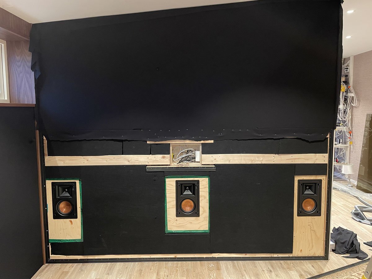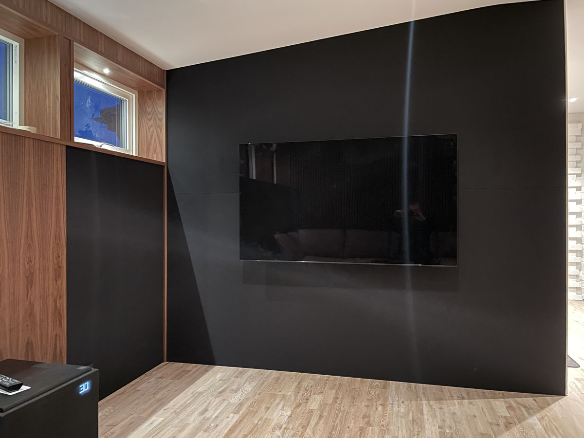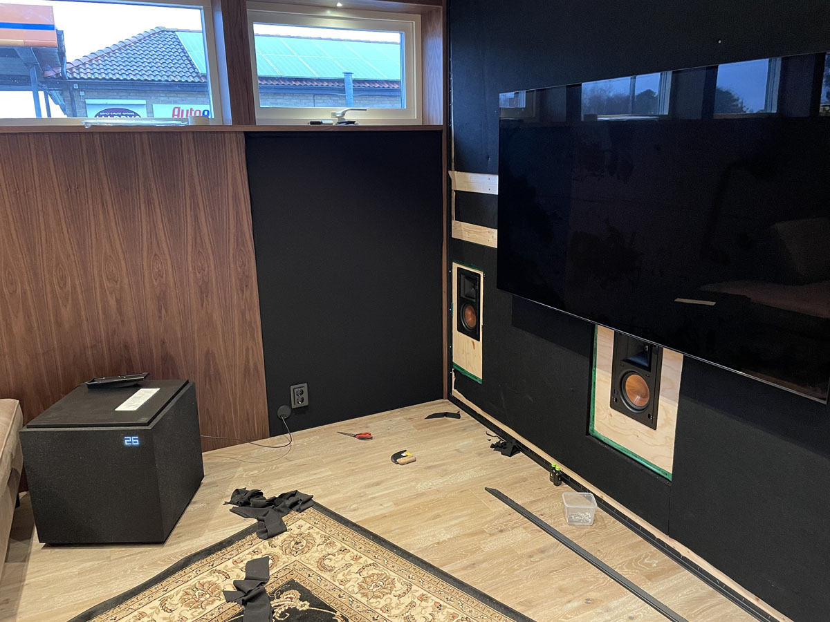 Akustikbehandlat vardagsrum med högtalarna dolda bakom transparent tyg i frontväggen, samt högtalare i taket för Atmos-effekter.